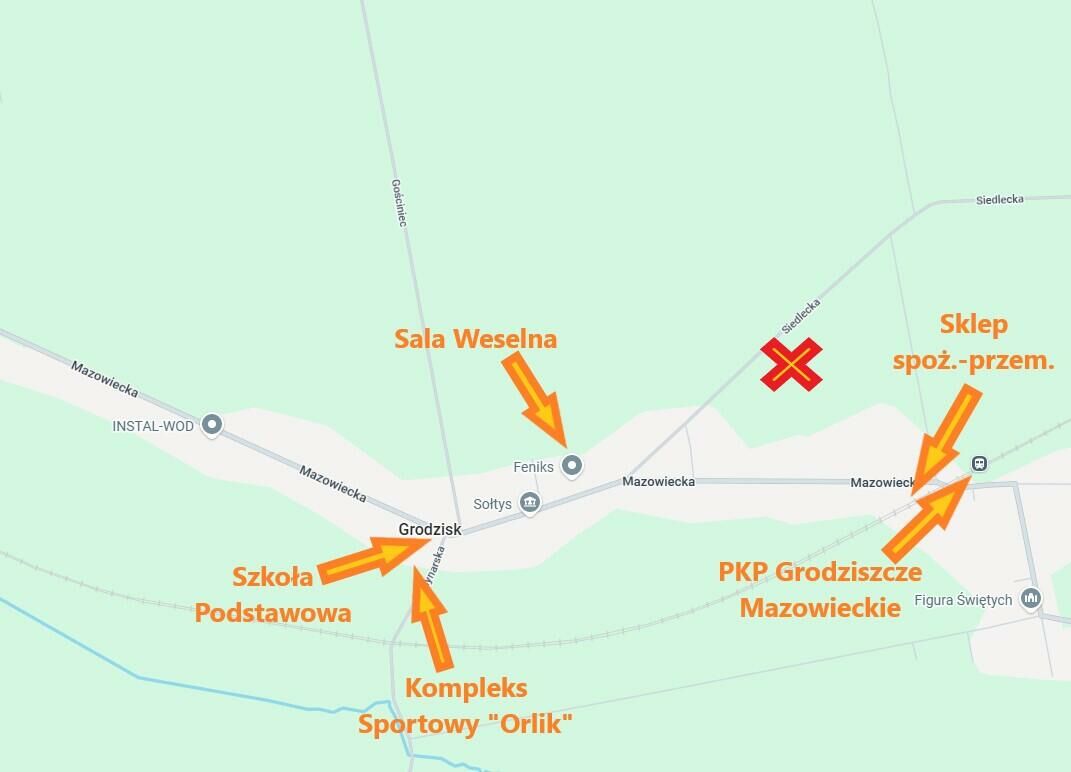 W bliskiej odległości: m.in. stacja PKP Grodziszcze Mazowieckie, stacja PKP Mrozy, szkoła, sklepy spoż.-przem., market Biedronka, Rudka - Sanatorium, kompleks sportowy Orlik.
